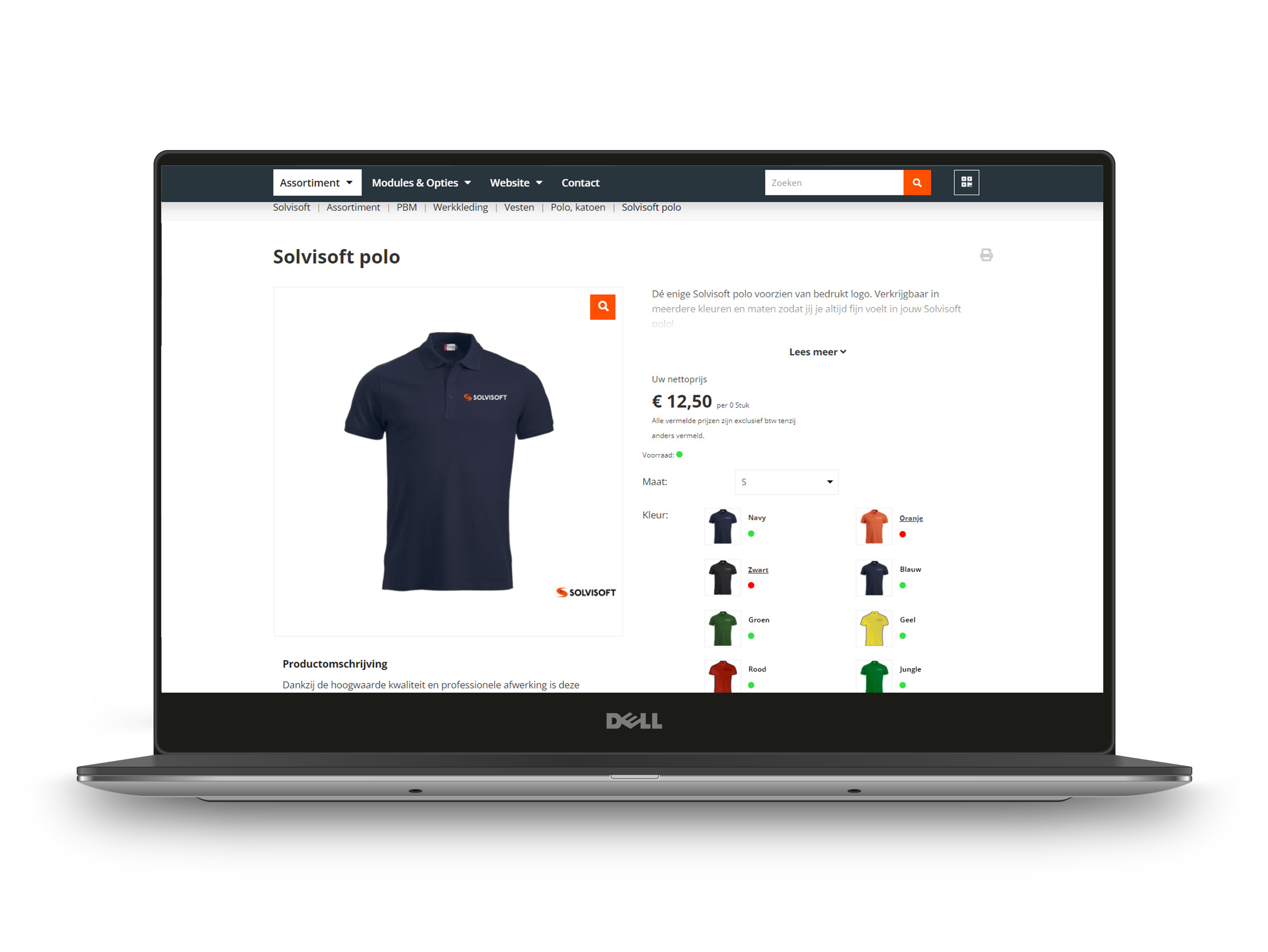 Met onze Productvariaties-module bundel je soortgelijke artikelen op een slimme en gebruiksvriendelijke manier. De klant krijgt in de webshop één overzichtelijke productweergave te zien, waarin eenvoudig de gewenste variant gekozen kan worden. Op de achtergrond worden voorraad, prijs en orderverwerking gekoppeld aan het juiste artikelnummer in het ERP-systeem.